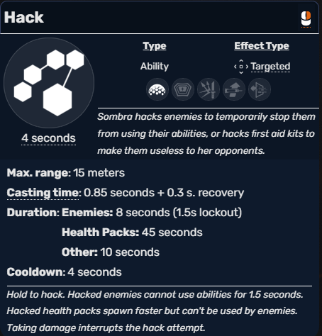 The core of Sombra’s kit. Essentially, Sombra is aware of the enemy team’s health and location in ways that other Heroes don’t get for free. Likewise, she does more damage to hacked opponents. This means the mere threat of being hacked is a threat at any time for everyone but the meatiest of Heroes.