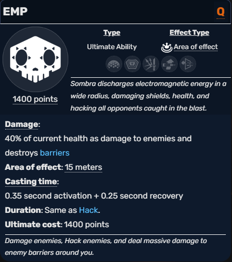 Arguably the biggest threat in Sombra’s kit, EMP hacks, damages, and rips through defensive abilities. Not only does EMP place hacked status on everyone it hits, but it also turns off ability-generated shields and overhealth such as Brig’s Rally and Lucio’s Sound Barrier. Additionally, it turns Sombra into a Final Fantasy-esque Black Mage and basically casts Gravity magic on the enemy team, dealing almost half their current health.