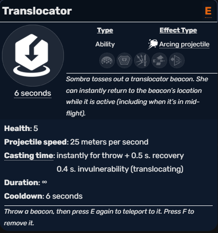 Sombra’s “get out of jail, free” card. Throw a beacon down anywhere on the map. Activate again in order to return to the beacon. Rinse, repeat. This allows Sombra to get out of trouble, relocate to safety, and come back to do it all again. A good Sombra player will value safely translocating out of trouble rather than risking death just for a backline kill.