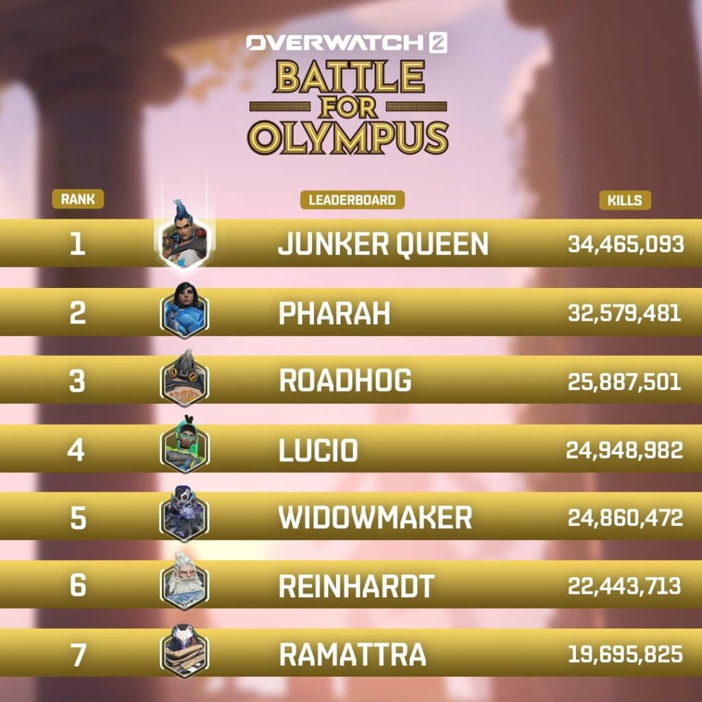 The leaderboard has been updated for Overwatch 2’s Battle for Olympus. Here are the heroes at the top of the charts.
