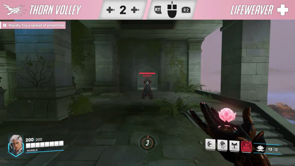 Lifeweaver has one weird quirk that may take time to learn: You must hit a button to switch between his Healing Blossom and Thorn Volley. The most likely solution is that this can be tied to your scroll-wheel like switching to Torb’s hammer, but it still may take some players adjusting to such a change.