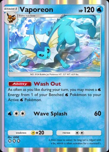 When on the field, Bench or Active, Vaporeon's ability lets you detach a Water Energy from any Pokémon on your Bench, attaching it to whatever Active Pokémon you have on the field.