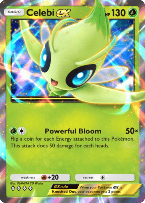 Celebi EX stands to be one of the most powerful cards in the game, especially if used correctly with a Serperior on the Bench. Its main move, Powerful Bloom, only requires two energies and allows players to flip a coin for each energy attached to the card. For each heads, this card does 50 damage.