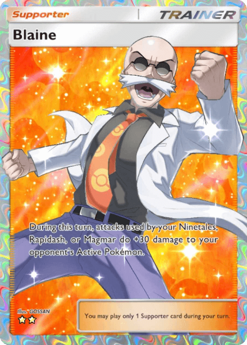 Some Trainer cards, like Blaine, are meant for specific types of decks. Having a card that helps a Grass-type deck in your arsenal when you have a Fire-type deck would do nothing for you.