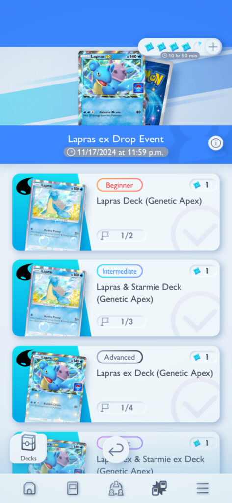In the limited-time Pokémon TCG Lapras event, you have the chance to earn a Lapras EX card through a chance pack. But, there is more to this event than just the chance packs and the Lapras EX card. For starters lets look at how to access the event in-game and what you need to do in order to get started.