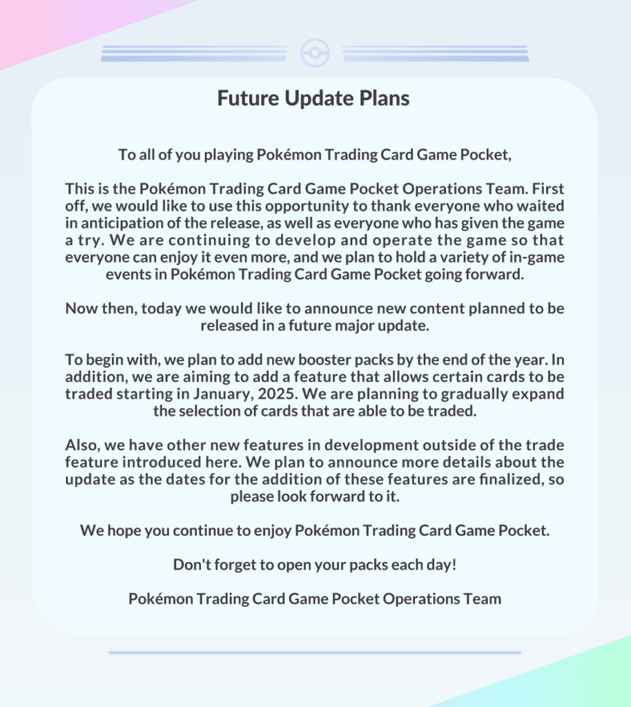 "We plan to add new booster packs by the end of the year," said Pokémon TCG Pocket on its official Twitter account.