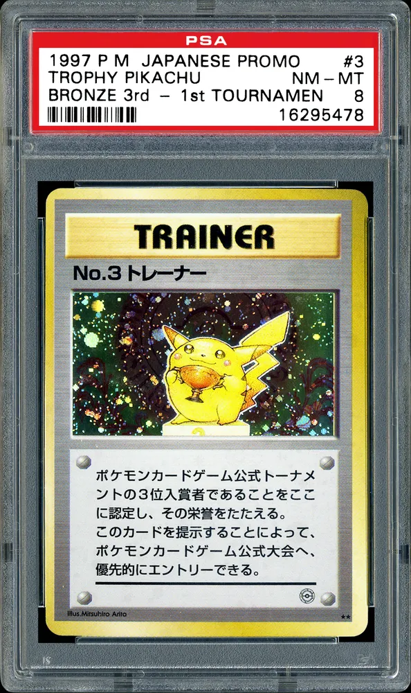 Like the Ishihara GX Promo card, the Bronze Pikachu No. 3 Trainer Trophy card also holds an incredible amount of value due to its limited numbers. In 1997, the very first Pokémon Trading Card tournament was held in Japan, where four competitors who placed third in the tournament were given these cards.