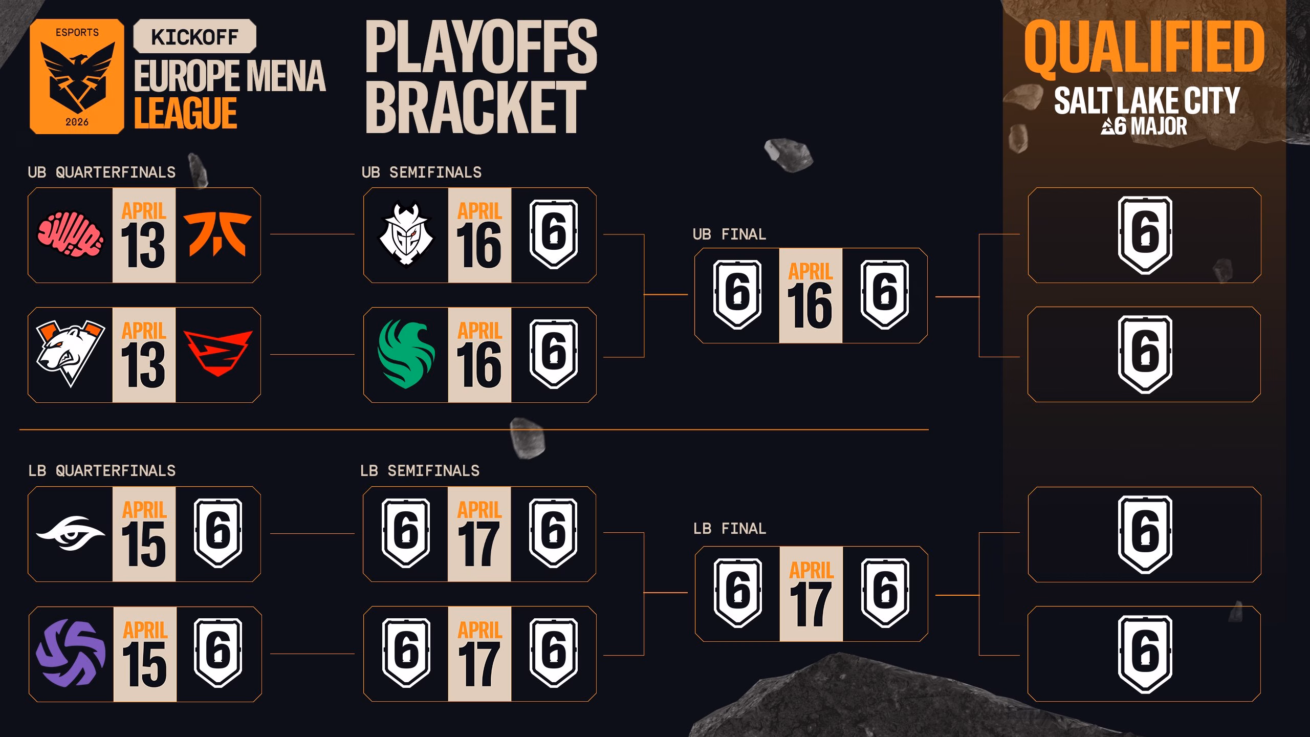 The regional qualifier for the R6 Salt Lake City 2026 Major happens in Europe and MENA (Middle East and North Africa) from April 13 to April 17. The playoffs include matches between world-class competitors, real Major trophy contenders.