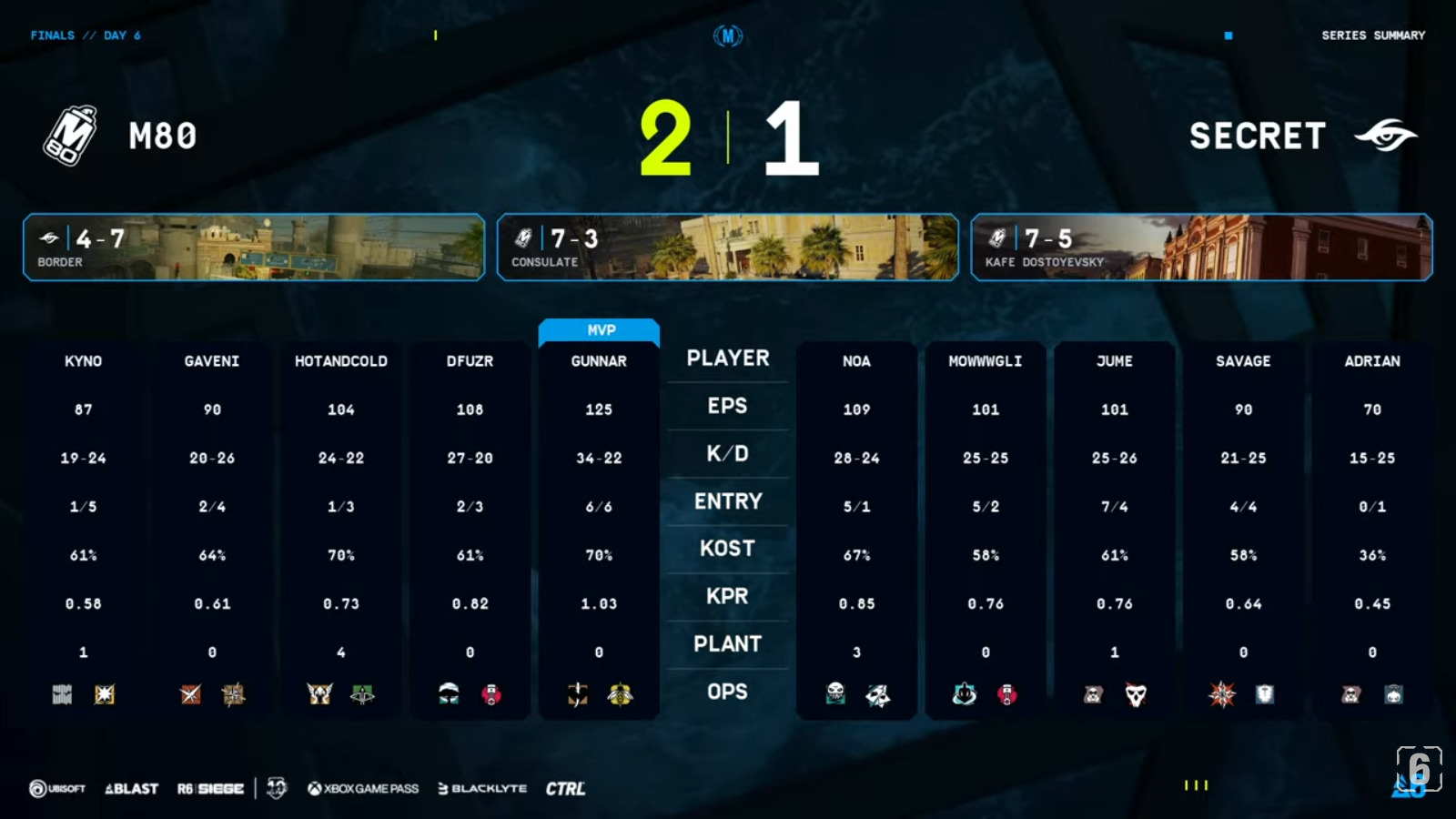 | Ninjas in Pyjamas 0:2 Wildcard 7:2 on Clubhouse 8:7 on Skyscraper | G2 Esports 1:2 Wildcard 7:2 on Nighthaven Labs 5:7 on Kafe Dostoyevsky 6:8 on Skyscraper | Wildcard 1:2 M80 2:7 on Consulate 7:3 on Kafe Dostoyevsky 4:7 on Skyscraper | M80 2:1 FaZe 5:7 on Chalet 7:4 on Skyscraper 8:6 on Clubhouse |