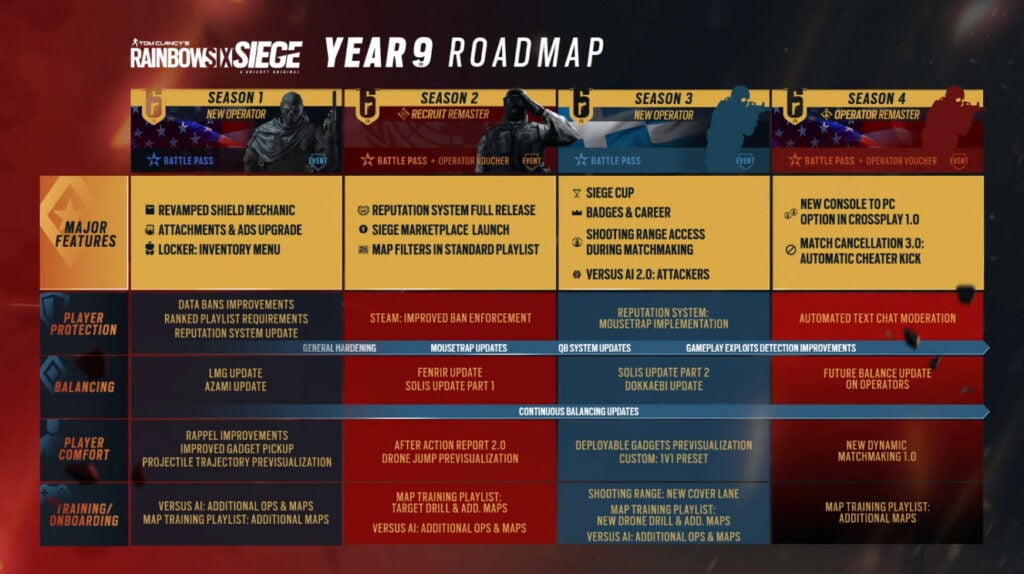Seasons are divided into four parts with several new features in each. The Year 9 roadmap starts in March, just after the Six Invitational’s conclusion. Let’s look at the meat of what is on the way for Rainbow Six Siege.