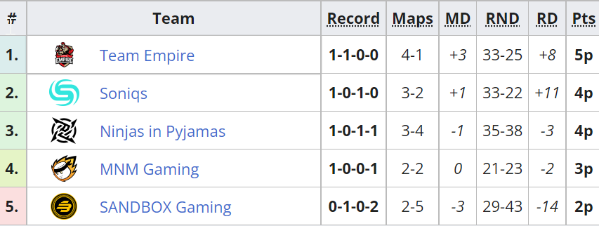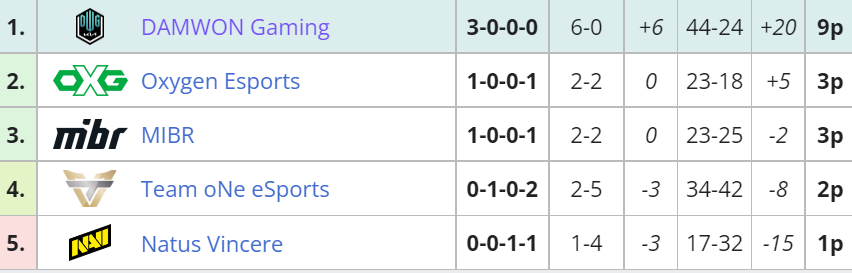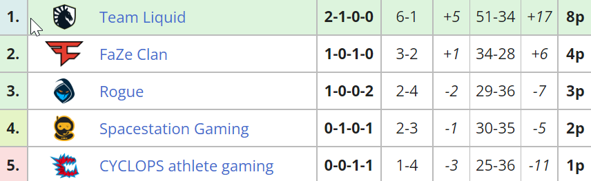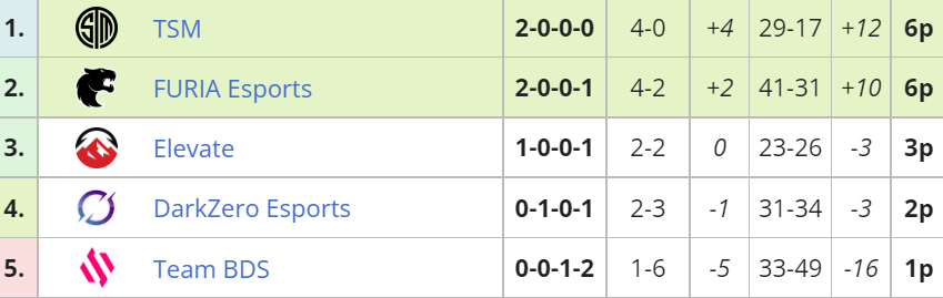 The winner of each group advances to the Upper Bracket Round 2 of the Playoffs. The next two teams go to the Upper Bracket Round 1 of the Playoffs. The team that places second gets the opportunity to pick its opponent (3rd placed team in any group other than their own). The pick order depends on the scores of all teams that placed second.