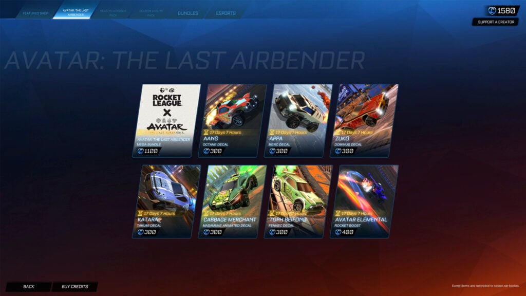 Finding the Rocket League item shop is easy. Simply launch the game and you’ll find the Item Shop button highlighted in a dark yellow-brown color as the second option on the main menu. Once you’ve entered the shop, navigate to the Avatar: The Last Airbender tab at the top of the screen. Here, you can purchase any items you wish using in-game credits. If you need to purchase credits, consider entering your favorite content creator’s Support-A-Creator code at the top right of your screen before doing so. It’s a great way to support someone while acquiring some cool new cosmetics!