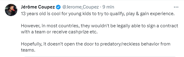 On the other hand, Jérôme Coupez, an agent for esports players, offered another point of view. “However, in most countries, they wouldn’t be legally able to sign a contract with a team or receive [cash prizes,] etc. Hopefully, it doesn’t open the door to predatory/reckless behavior from teams,” he wrote on X.