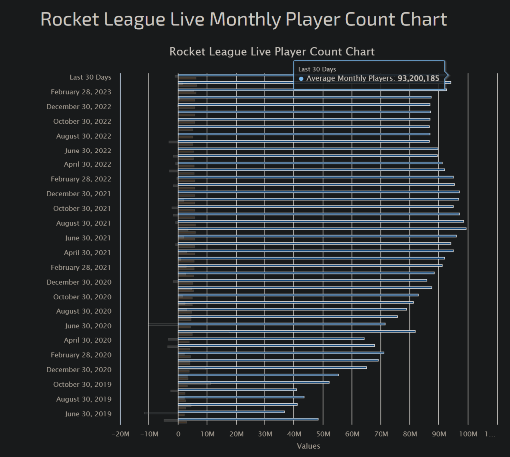 On average, 93,200,185 players have played Rocket League in the past thirty days as of April 10, 2023.