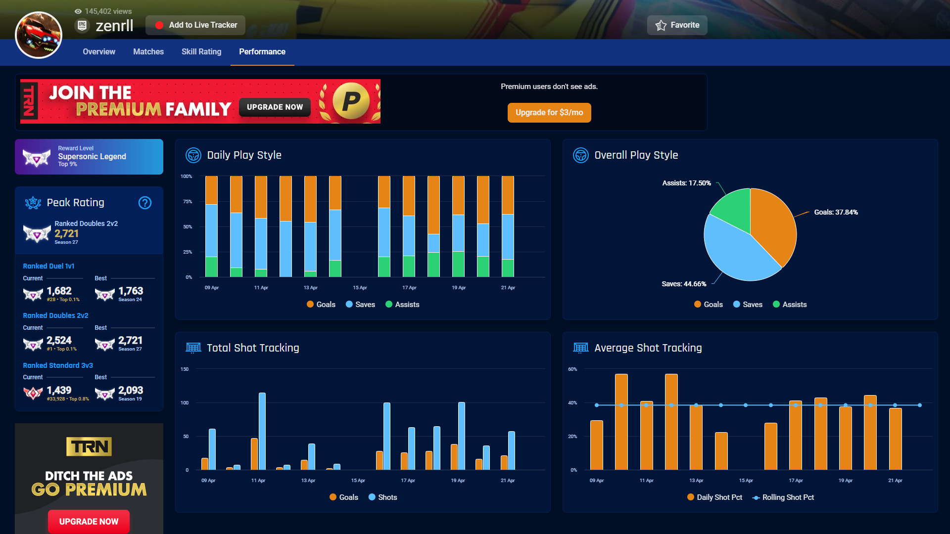 The final tab available is labeled Performance. Here, the RL Tracker displays four graphs showing different basic stats that give a little insight into a player’s playstyle. Such stats include goals, assists, saves, shot accuracy, and how those things change day by day.