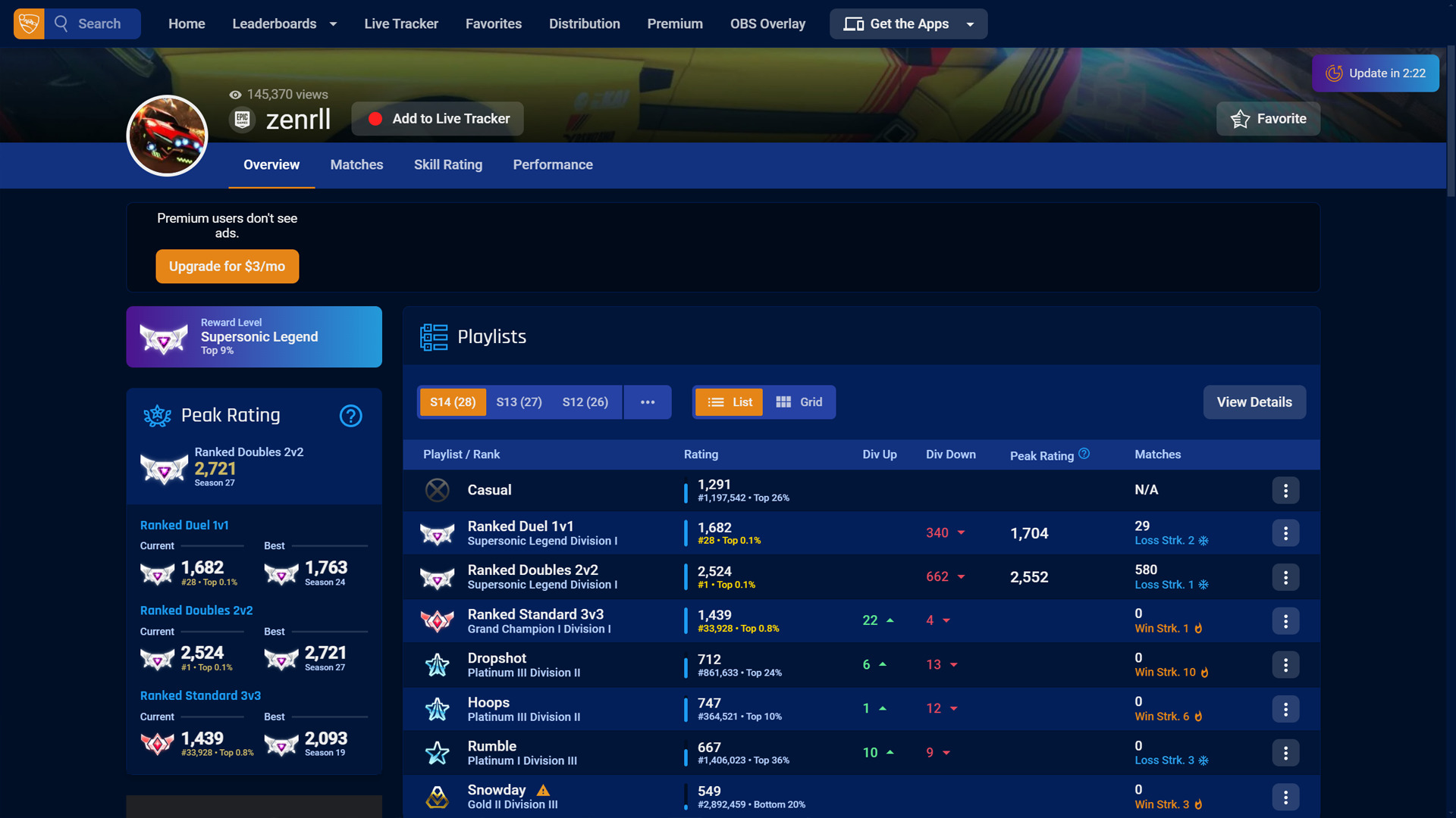 The profile overview contains the majority of information most people take interest in at a glance. Current and peak ranks for each game mode are displayed neatly next to one another.
