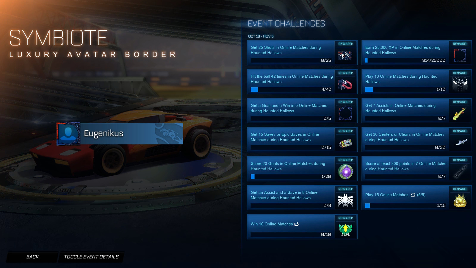 Be an active Rocket League player during the Haunted Hallows season and contribute to five victories of your team. A Venom-themed Avatar Border will be your reward.