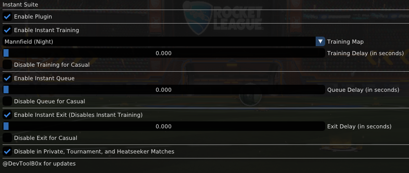 Finally, we have the Instant Suite plugin to elevate your Rocket League experience. It optimizes your gaming time with the option of Instant Queue, Instant Training, and Instant Exit. This means there’s not a second wasted and that means more gaming hours!