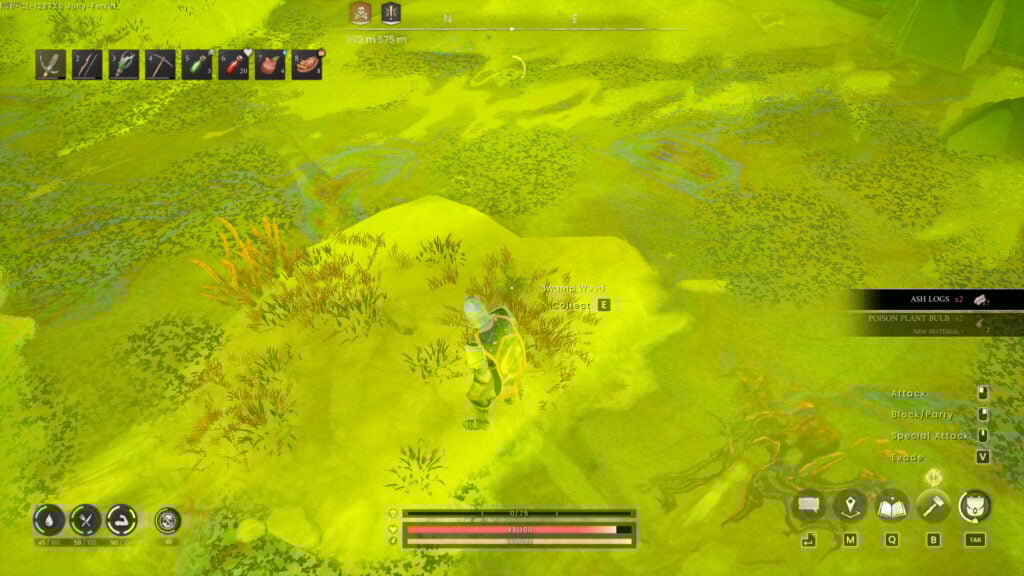 Once you’re safely in the swamp, you need to start looking at the ground for a small, green weed that grows near trees and the green poison river that runs through the entire region. Swamp Weeds can be harvested directly from the ground, but they’re fairly rare and extremely difficult to see from far away, as you can see in the screenshot below.