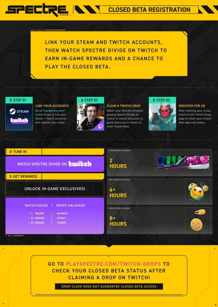 Another method that requires some luck, but might be quicker than requesting access is by watching streams. You can earn access, and other goodies for the Spectre Divide Closed Beta, through Twitch Drops.