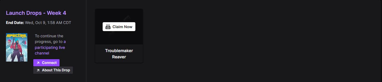 This specific Twitch Drop is only available until 11:58 a.m. PT on October 9. Then it goes away and we can probably expect a new reward. So, here are the easy steps to take in order to obtain the Troublemaker Reaver skin for Spectre Divide from Twitch Drops: