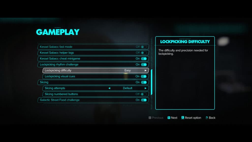 If you're having a lot of trouble with lockpicking, then you can go into your gameplay settings and update the lockpicking difficulty. You can toggle on the lockpicking visual cues as well.