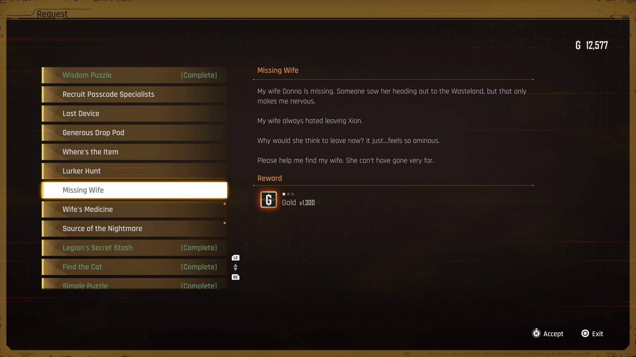 With every Bulletin Board request in Stellar Blade, you have to go to the Bulletin Board to accept it. This is near the R Shop, run by Roxanne, and is marked on your map. So, get to the request list to see Missing Wife with this message: