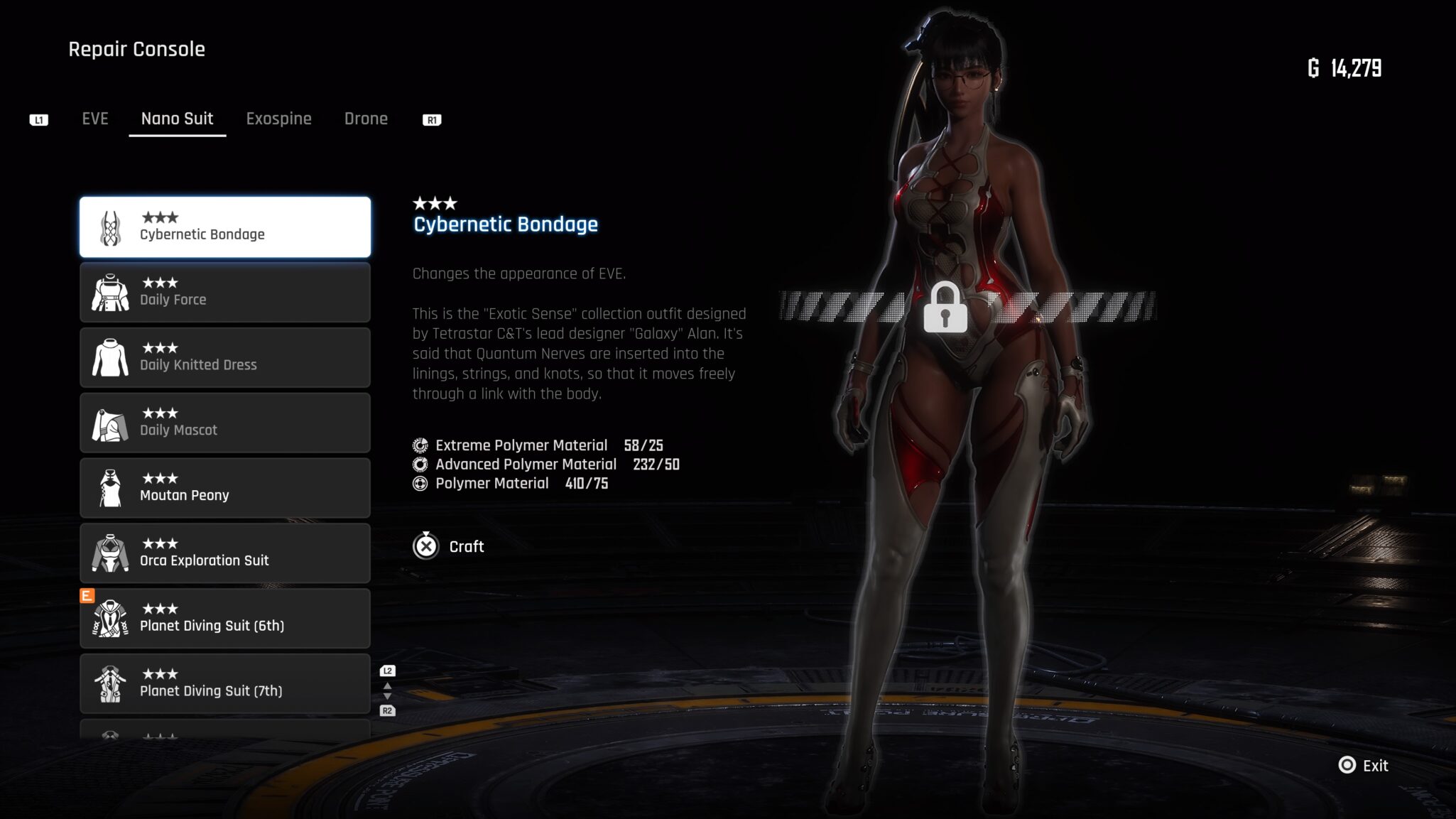 To craft, you can go to any repair console available at the many camps you claim, or you can talk to Lily who will act as a repair console for you. Find the Cybernetic Bondage suit from the list and hold X to craft.