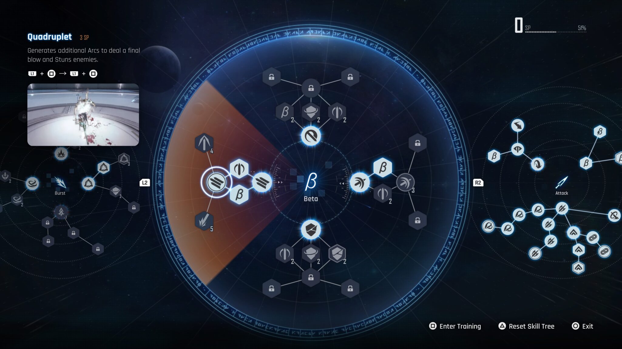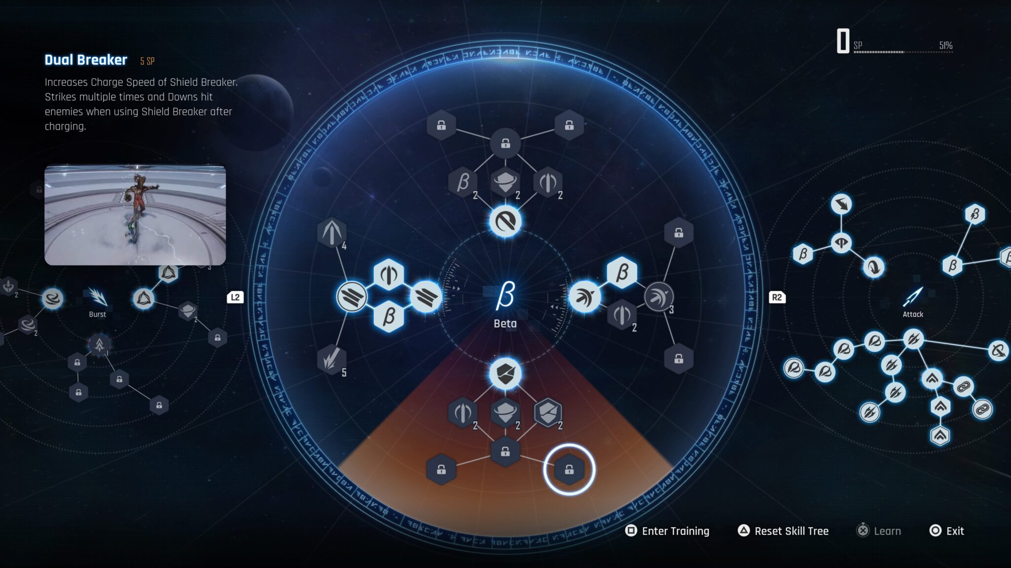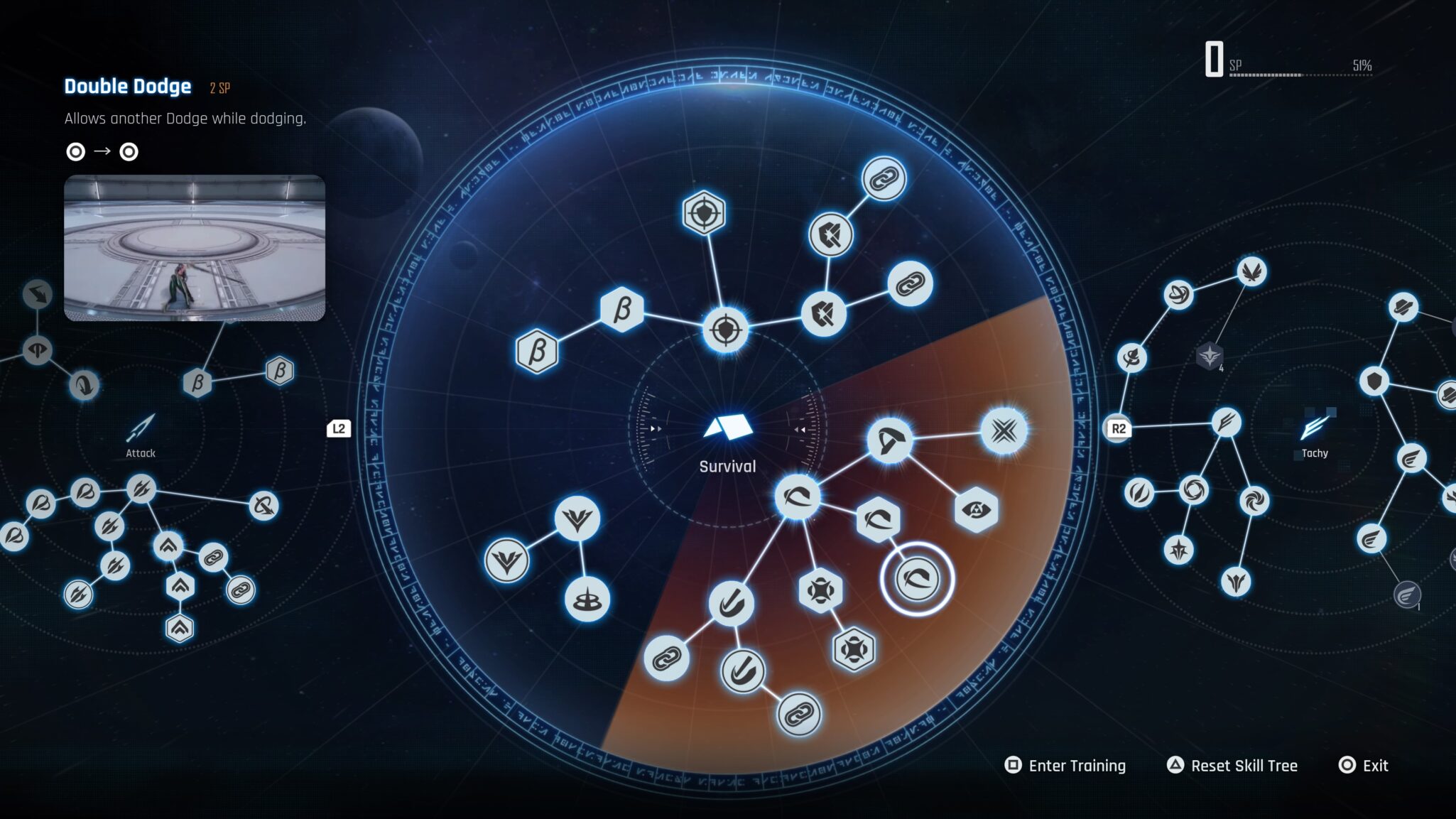 From there, you can view the different Skill Trees and spend your Skill Points. As well, only at the Skill Settings machine can you press Square to Enter Training. This allows you to try any skills, even those you don’t have, so you can decide if you want it before obtaining it.