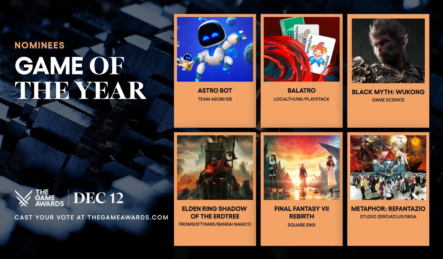 From the list of six nominees for Game of the Year, few would argue with the inclusion of the lovable 3D platformer Astro Bot released in September. Likewise, the inclusion of Final Fantasy VII: Rebirth and Black Myth: Wukong seemed inevitable given their impact and stature.