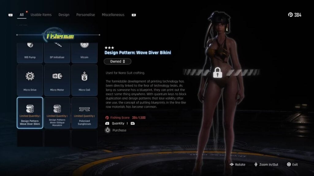 | Wave Diver Bikini | Purchase from Clyde in the Great Desert Oasis for 1,500 Fishing Score. |