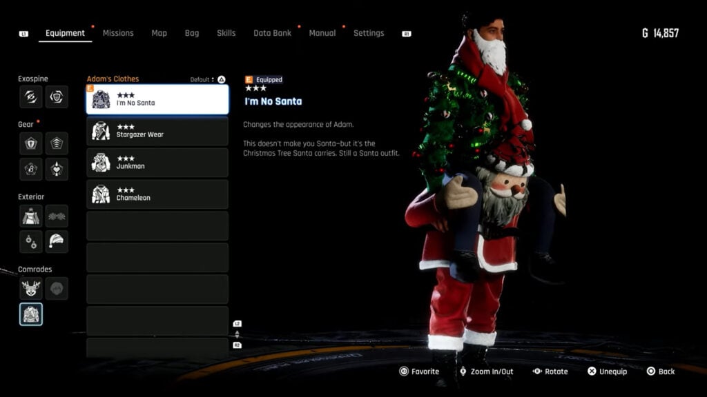Get all of the free goodies with the 1.010 patch! This include the Santa Dress for EVE, the “I’m no Santa” outfit for Adam, and a bunch of accessories. All the information you need is in the Christmas tree located in Xion’s city center.