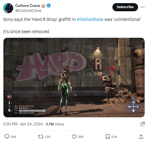 Sony quickly addressed the “Hard R” Graffiti issue in Stellar Blade, telling reviewers the graffiti was “unintentional”, promising an immediate patch, which was swiftly deployed.. The graffiti now says “Crime” after the game’s New Game Plus patch. In the grand scheme of things, this was a small issue. Reviewers pointed out an unintentionally controversial piece of in-game art. The developers addressed it as soon as they found it.