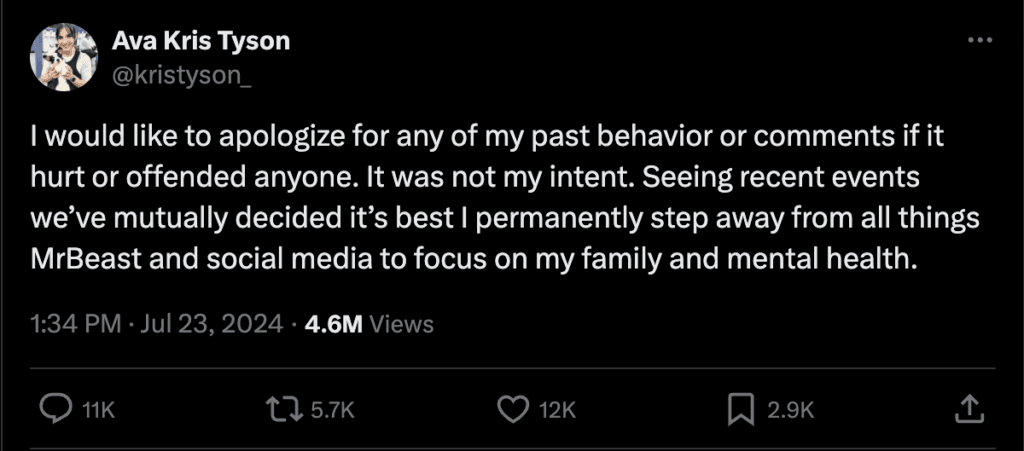 "I would like to apologize for any of my past behavior or comments if it hurt or offended anyone. It was not my intent," said Tyson via Twitter. "Seeing recent events we’ve mutually decided it’s best I permanently step away from all things MrBeast and social media to focus on my family and mental health."