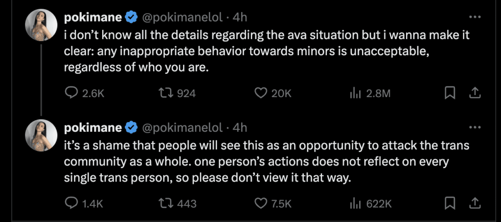 "I don’t know all the details regarding the Ava situation," Pokimane said in a Twitter post. "But I want to make it clear: any inappropriate behavior towards minors is unacceptable, regardless of who you are."