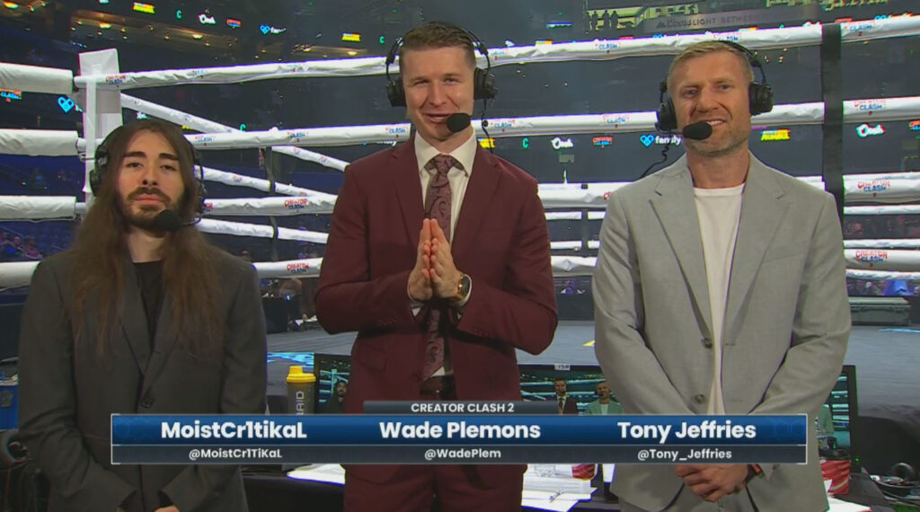 The technical issues continued, with the commentary team, shown above, starting off muted. This was eventually resolved. The event cuts to Esfand and Amouranth, who are interviewers for the night. Amouranth plugs her fight later in the year at ibai’s boxing event.