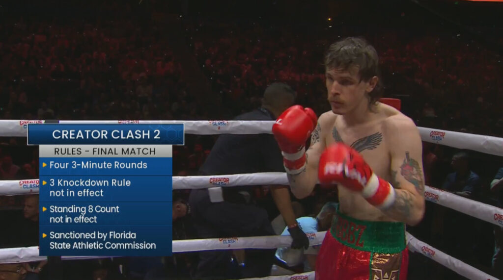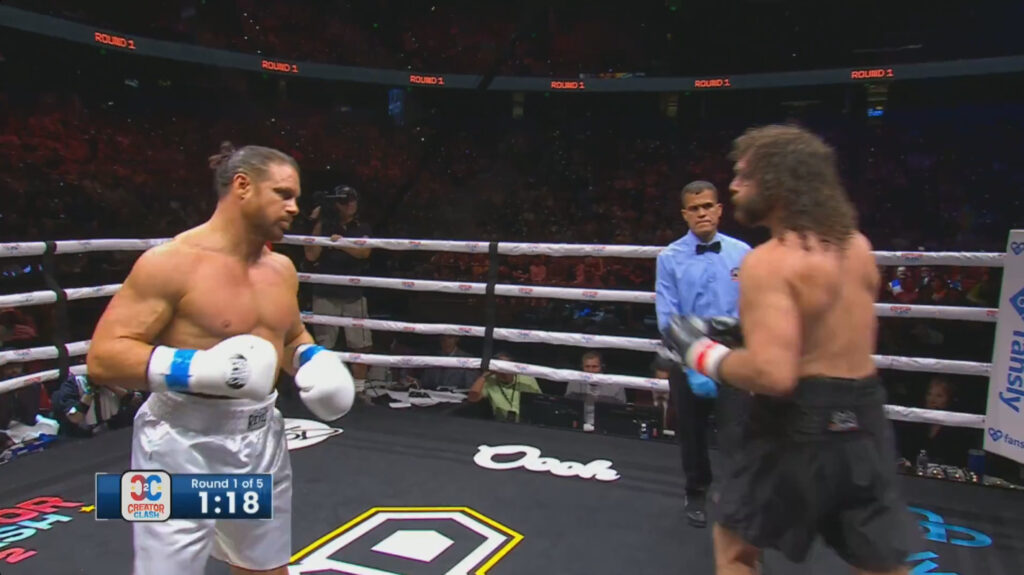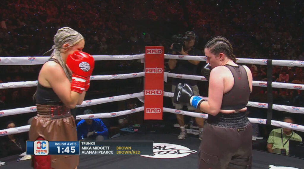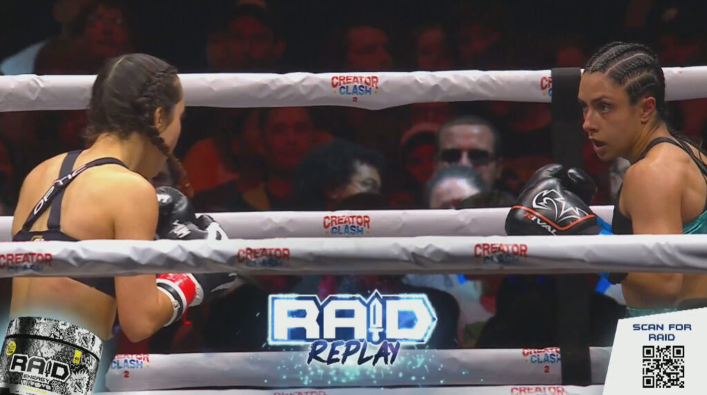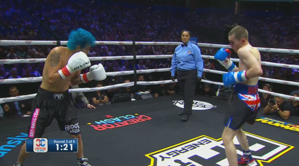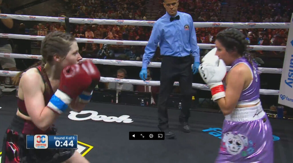 Round two is more aggression. What’s so impressive for an influencer boxer is that Khare can get in under the taller and longer Botez. So hard to do, and makes it seem effortless.