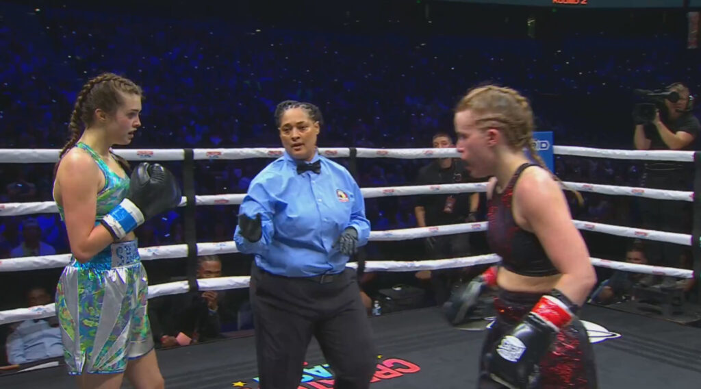 Round two, Mika rushed out with a big shot, but Alanah didn’t go down. Now both back to slow slugging. Very slow. Methodical. There’s almost no foot movement. I think we get a stoppage because of lack of defense. For round three, there’s so little movement, it’s hard to decide who’s winning.