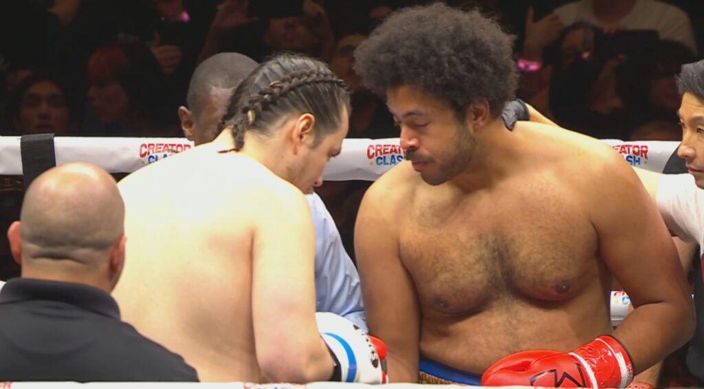 Round four, there’s no power behind the punches. Hands on hips. Referee is laughing, he knows he’s not got much to do this match. Round five there’s some energy, but really there was a huge stamina deficit.