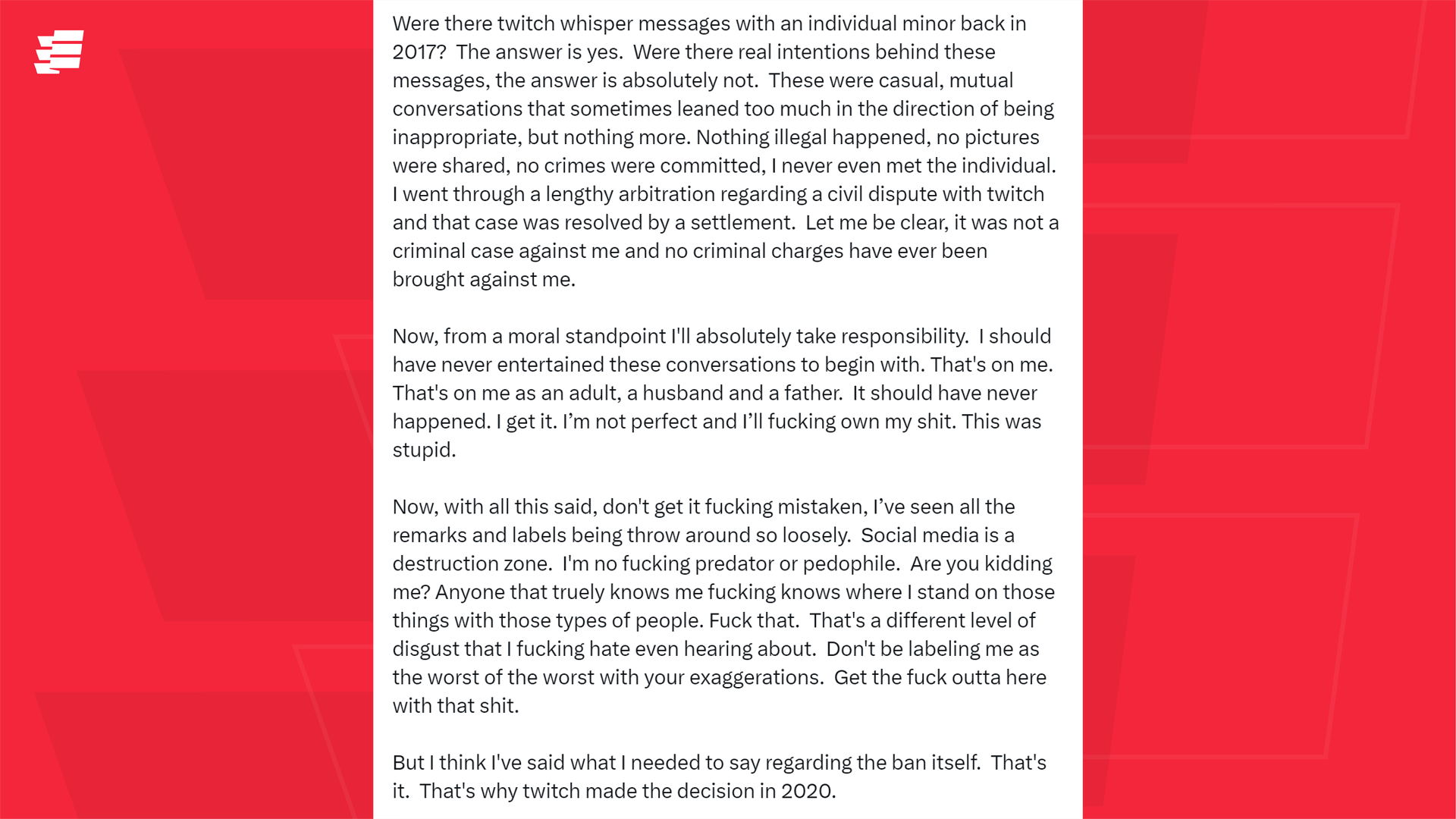 There were “inappropriate” messages with a minor: Dr Disrespect admits to communicating with a minor back in 2017 via Twitch’s Whisper feature. He describes the messages as sometimes leaning “too much in the direction of being inappropriate,” while assuring that there was never any sharing of pictures or meeting with said minor. Notably, he edited the post to remove the word “minor,” but quickly added it back in after backlash.
