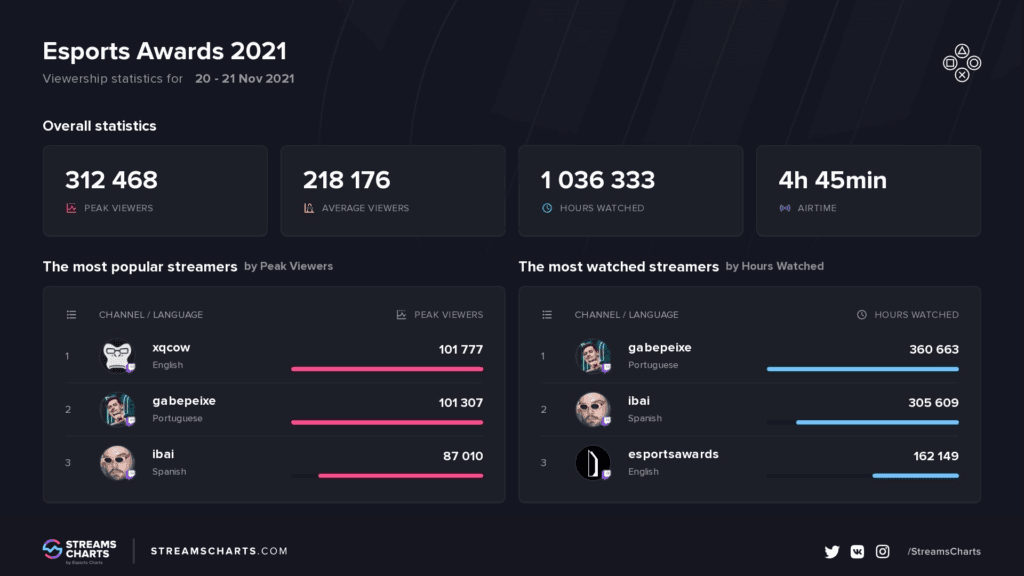 Ibai, formerly of G2 Esports, and LOUD's Gabepeixe brought in massive audiences of Spanish and Portuguese viewers, with the pair having more hours watched for the event than the official Esports Awards channel. Both of them accounted for over 64% of the hours watched for the event.
