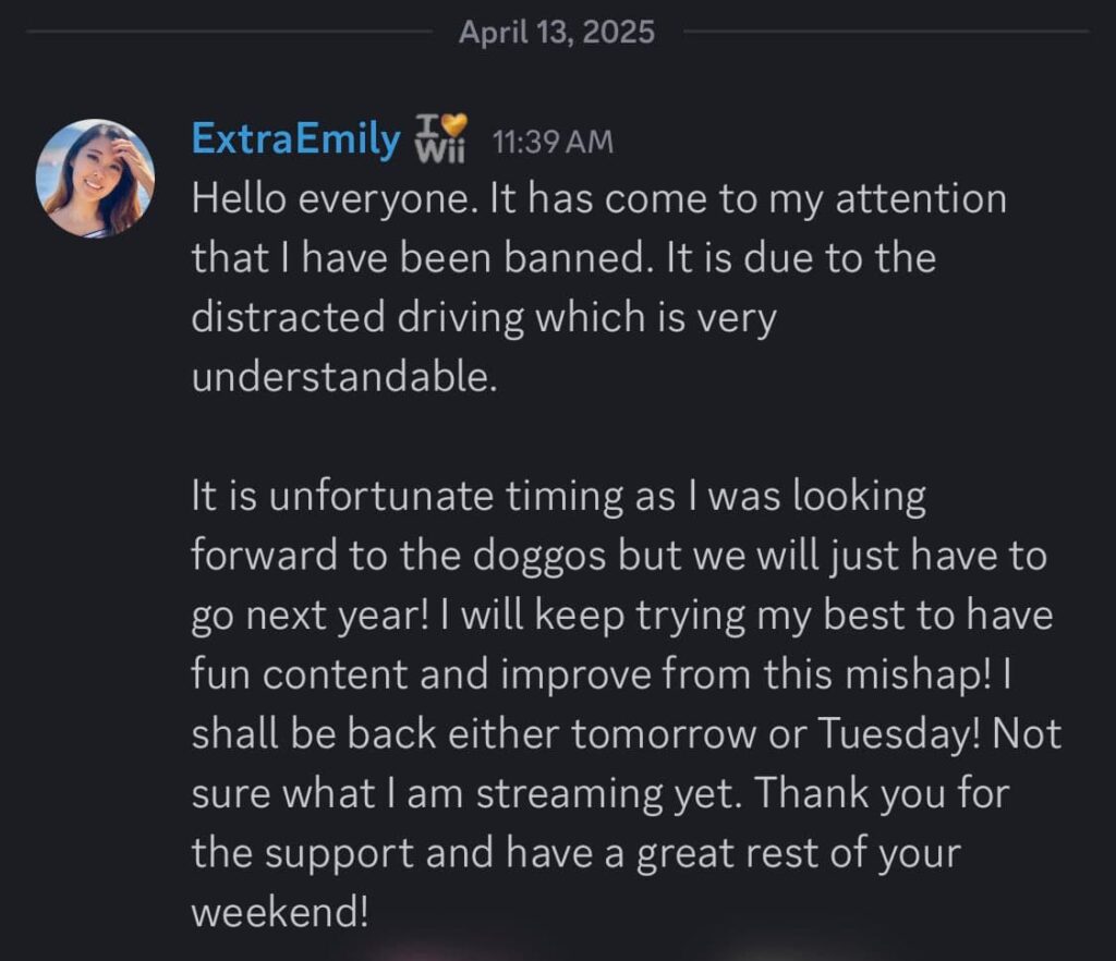 The ban occurred at approximately 1:34 a.m. PT on April 13, 2025. Per ExtraEmily via her Discord channel, she was only banned from Twitch for just a day or so. She responded by calling the incident a “mishap,” but that the ban was “understandable.”