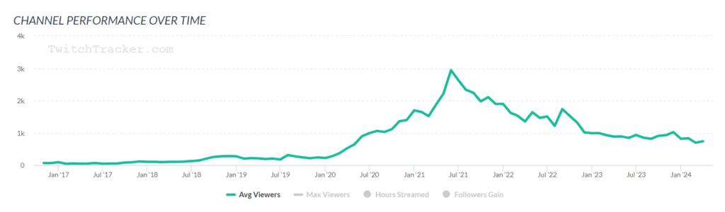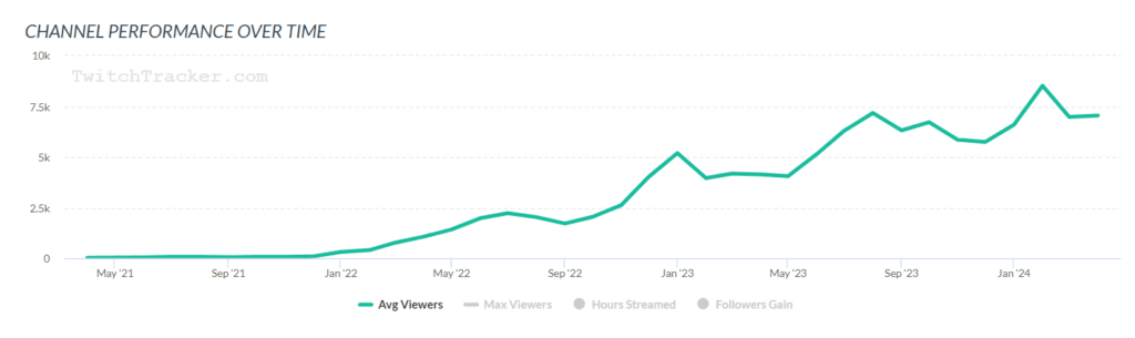 Data (April 2024) | Average Viewers 738 7,050 | Max Viewers 1,613 17,990 | Hours Streamed 161 94 | Followers Gained 1,284 28,820 |