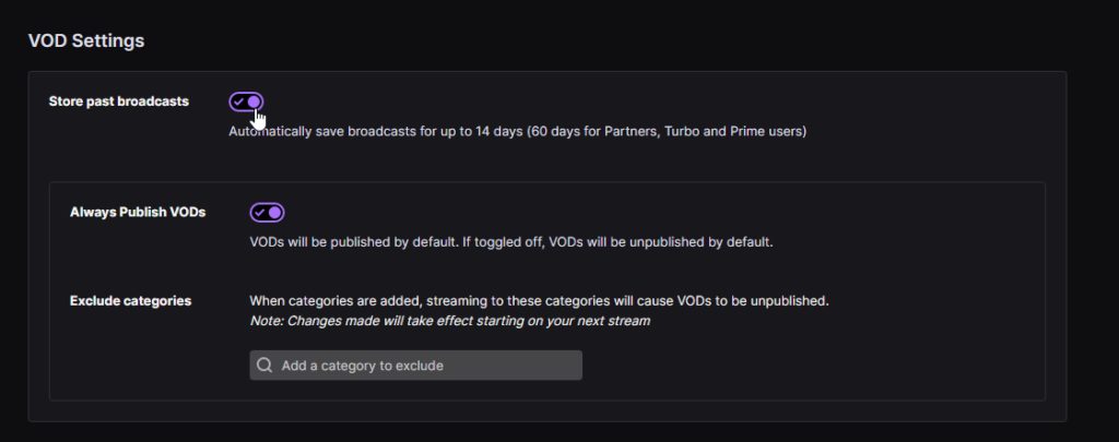 - In the Stream Sub-section under VOD Settinghs tick the checkbox marked “automatically archive my broadcasts.”