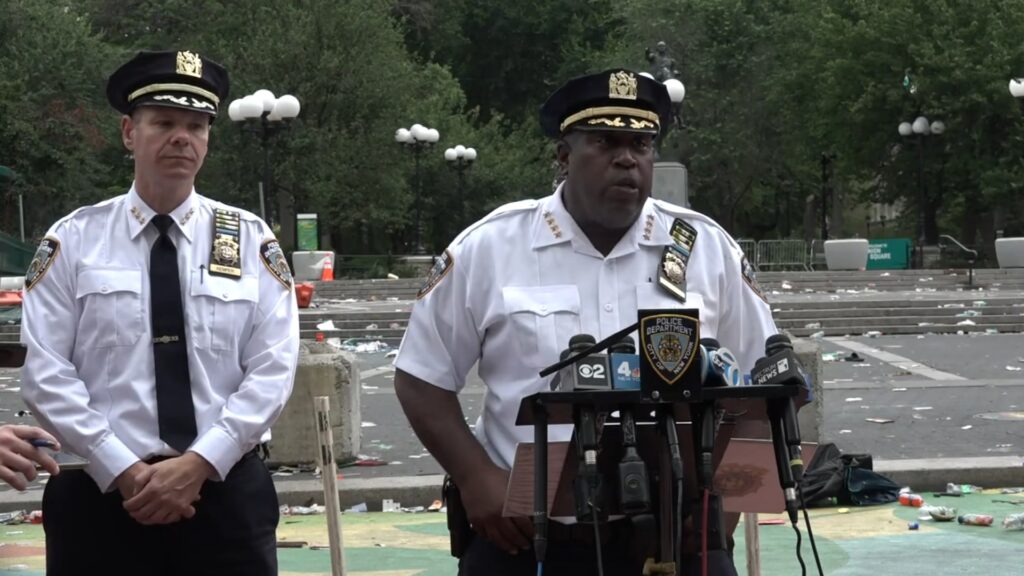 According to the NYPD, a construction site located within the park was looted and articles were thrown including paint cans, bottles and rocks. “People were walking around with shovels, axes and other tools from the construction site,” said Jeffrey B. Maddrey, NYPD Chief of Department. “In addition, people were lighting fireworks and throwing them at police.”