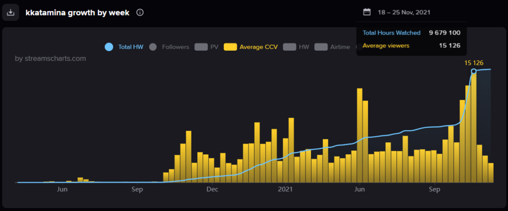 This is a new record for the platform. Kkatamina is still rising in popularity – In October of this year she received 164k hours of watch time and that figure has risen substantially by a staggering 4.8 MILLION hours watched by her 453 thousand followers. (Accurate as of 11th of December 2021)