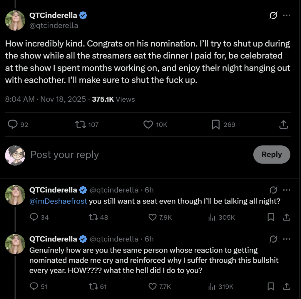 This post garnered over 1 million views in just under 12 hours, and many in the replies gave QTCinderella her laurels. The quotes were a little more divided, though, with some expressing support for the event while others calling the Streamer Awards a “friend group show.”