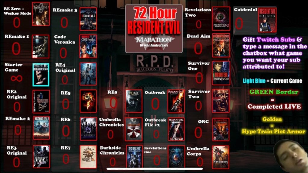 There are 25 Resident Evil games on the list. Viewers can vote for a game by subscribing to his channel to increase the number beside your chosen game. Last time, it was Resident Evil 2 that spelled the end for OddlerPro. Tomorrow and for 72 consecutive hours, he’ll hope to transition from ResidentSleeper to ResidentWinner.