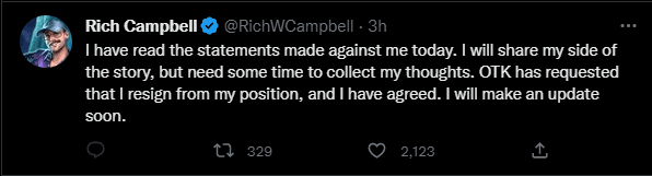 Several hours after the sexual allegation, Rich Campbell stated that he will share his side of the story soon. He also resigned from OTK as per the organization's request.