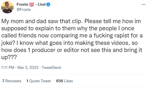 Froste took to Twitter on the evening of March 3rd to complain about a now-removed video on 100T’s YouTube channel. In the now-deleted post, he complained that his parents had seen the clip that allegedly compared Froste to disgraced comedian Bill Cosby. Cosby has been the subject of a dozen sexual assault cases since 2014.